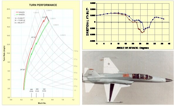 Curiosamente, esta carena para ocultar el mecanismo de extensión y retracción de los slats produjo un efecto sorprendente. En las pruebas en vuelo, el piloto comprobó con satisfacción que el avión no entraba en pérdida a altos ángulos de ataque tal como sucedía con los T-38 y tal como los cálculos ingenieriles predecían. Por el contrario, el avión mantenía una sustentación considerable. Los ingenieros pronto se dieron cuenta de que las protuberancias carenadas del mecanismo de extensión/retracción de los slats generaban un vórtice que al pasar por encima del ala mantenía la capa límite pegada a esta. Acababan de descubrir los LEX que tiempo después serían aplicados a multitud de cazas, entre ellos al F-18.
